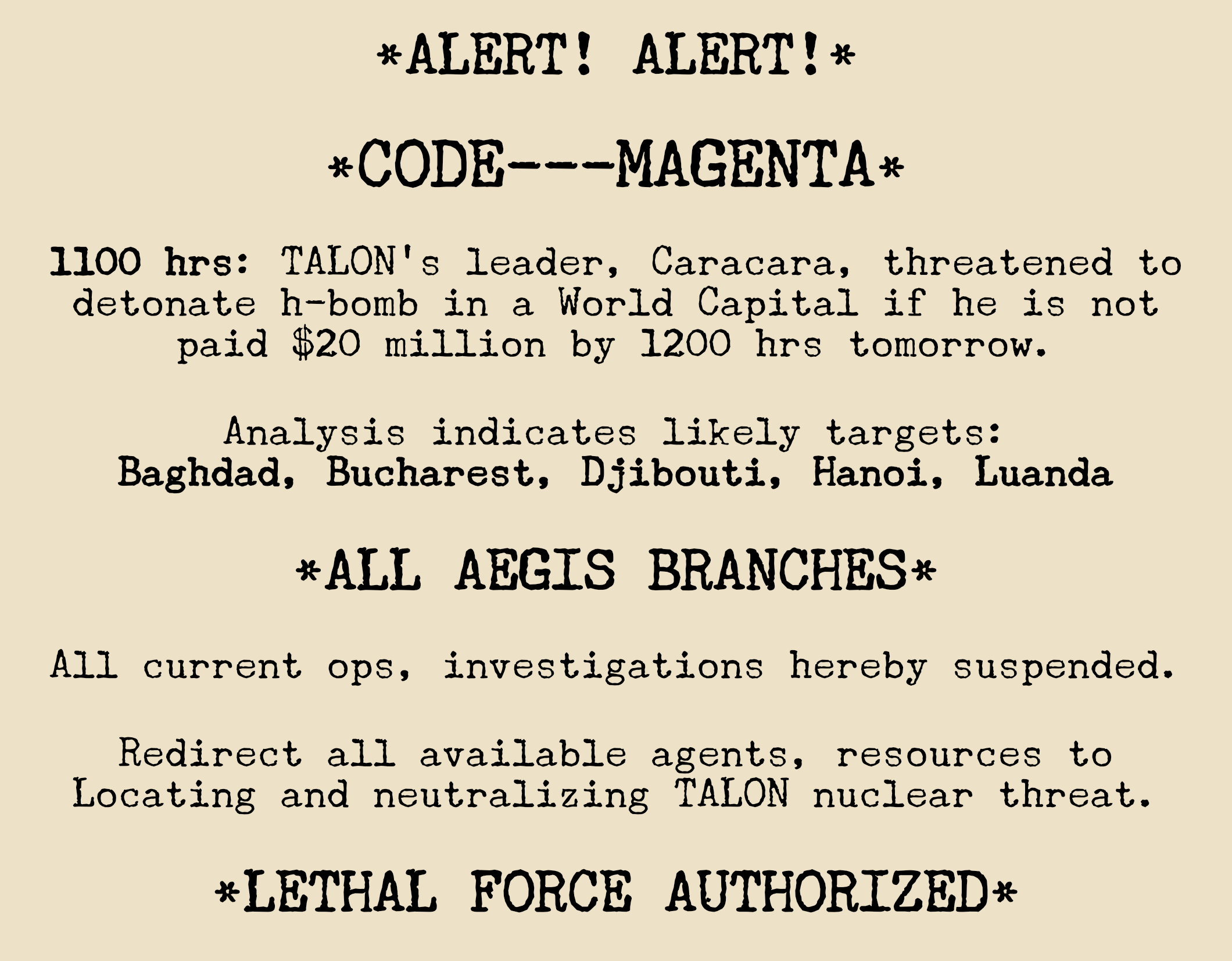 DESIGN: An endless variety of spy missions using the provided Random Mission Generator.